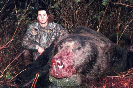Гигантский медведь людоед. Произошел данный инцидент в США штат "Аляска". Осенью 2009 года, во время охоты на оленя, молодой человек буквально в 50-и метрах от себя увидел огромный силуэт который начал двигаться в его направлении. Парень успел среагировать и выпустил в цель целый комплект боеприпасов из семи миллиметровой полу-автоматической винтовки. Медведь рухнул всего каких то паре шагов от охотника, но продолжал дышать и шевелиться. Сменив пустой магазин на снаряженный, были сделаны контрольные выстрелы. Далее, комитет Департамента охоты и рыбалки штата Аляска определил что это была разновидность бурого медведя "Грызли" самый большой представитель из найденных за все время в мире. Вес данной особи приблизительно 720 кг. длинна вытянутого на земле от задних лап до передних 4.3 метра (т.е он мог бы спокойно посмотреть в окно второго этажа), длина когтей от 10 до 15 см. Осмотрев брюшную полость Грызли, специалисты нашли в нем остатки людей. Исследователи определили что за прошед