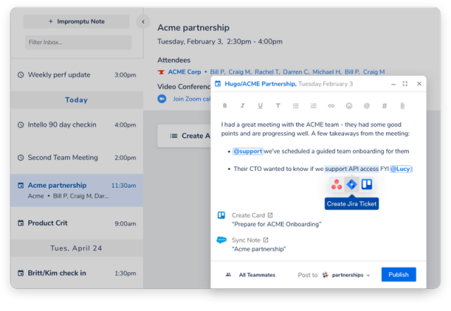 Приложения трансформируют конференцию в блоки цифровой информации. С развитием интернета мы стали понимать, что цифровую информацию можно очень быстро отправить куда угодно и кому угодно. А софт типа Hugo использует облачные технологии для передачи наиболее важных результатов вашей встречи всем, кому они нужны. Его можно использовать для создания и рассылки апдейтов по разным обсуждениям и постановки задач тем, кто пропустил видеозвонок, для автоматического добавления информации в CRM, для связи с определенными командами в Slack. Наконец, он прекрасно интегрируется в другие приложения для бизнеса — Salesforce, Jira или Trello. Вы можете начать рассылку, не дожидаясь окончания встречи, и передавать новую информацию через приложение тем, кто не участвует в конференции.