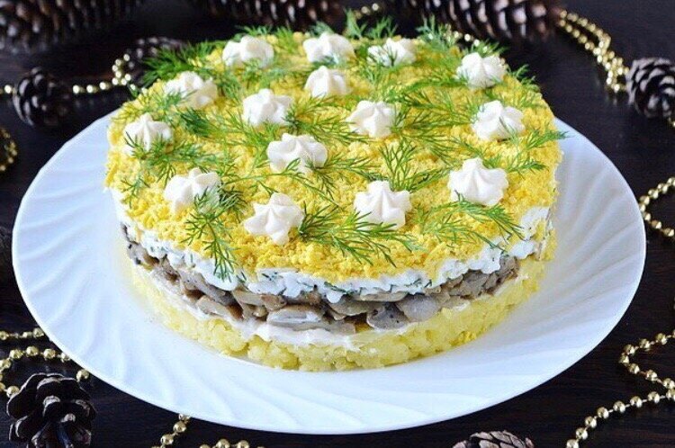 Если вы - тот счастливчик, который принимает гостей в Новогоднюю ночь - это повод как следует подготовиться! Удивите своих гостей вкусным салатом "Грибы под шубой". Ингредиенты: 1. Картофель - 2 шт. 2. Свежие грибы ( я использовала шампиньоны) - 400 гр. 3. Любой плавленый сыр - 2 упаковки. 4. Куриные яйца - 4 шт. 5. Репчатый лук - 1 шт. 6. Свежая зелень для украшения салата. 7. Соль, майонез - по вкусу. Способ приготовления: Первый слой - картофель. Отварить картофель в мундире. Остудить. Отчистить от кожицы и порезать небольшими кубиками. Слой слегка солим (не обязательно) и смазываем майонезом. Второй слой - грибы. Для этого их хорошо промыть и порезать небольшими кусочками. Грибы следует обжарить на разогретой сковороде с растительным или сливочным маслом, слегка посолить. Готовые грибы выложить на салфетку, чтоб она впитала в себя лишнее масло. Смазать слой майонезом. Третий слой - лук. Репчатый лук чистим и мелко нарезаем. Четвертый слой - куриный белок. Яйца отвариваем. Чи