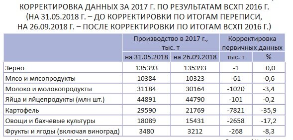 Эксперты Российской академии народного хозяйства и государственной службы при президенте РФ (РАНХиГС) заявили о том, что по итогам Всероссийской сельскохозяйственной переписи (ВСХП) 2016г. статистика была серьезно скорректирована в сторону снижения. Как выяснилось, завышенными оказались показатели в производстве молока, овощей, бахчевых, фруктов и ягод, пишет The DairyNews. В отчете академии за подписью профессора Центра агропродовольственной политики РАНХиГС Василия Узуна отмечается, что "используемые методы статистического наблюдения не всегда позволяют объективно судить о происходящих на селе процессах. При оценке темпов развития сельского хозяйства следует учитывать скорректированные данные Росстата".