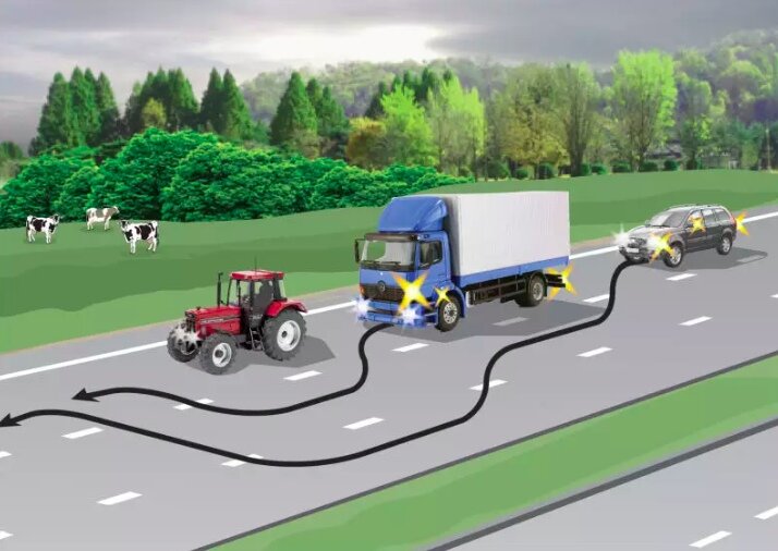 Действие происходит вне населенного пункта, дорога имеет три полосы в данном направлении. Водитель легкового автомобиля планирует занять крайнюю левую левую полосу для совершения опережения грузового автомобиля, который будет опережать трактор.