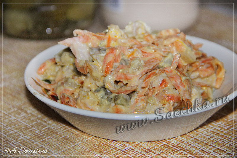 Салат «Обжорка» - это когда с приходом хоть и не большого, но похолодания что-то срочно захотелось съесть существенного, калорийного. В холодильнике ещё осталось запечённое куриное филе. Вот её и приспособим в салат. Если нет готовой курицы, то просто сварите куриное филе - это не займёт много времени. Итак, готовим по классическому старому советскому рецепту: Ингредиенты: Как приготовить: