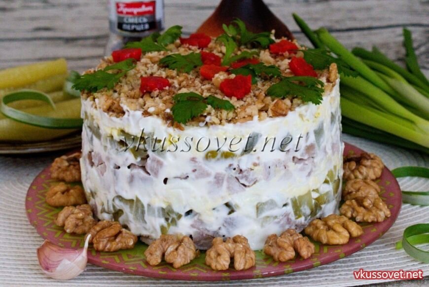 Рецепт приготовления салата черный принц со свининой и маринованными огурцами. Салат Черный принц состоит из четырех основных ингредиентов: отварного мяса, отварных яиц, соленых огурцов и грецких орехов. Эти продукты вполне доступны и практически у каждой хозяйки имеются в запасе. Традиционно закуска выкладывается на сервировочном блюде слоями, каждый пропитывается майонезом. Для приготовления используется любое отварное мясо: птицы, свинины или говядины. Какое мясо использовать каждая хозяйка решает сама – у всех свои предпочтения, в этом рецепте салат готовится из свинины. Так как для приготовления салата хозяйки используют различного вида продукты, то трудно однозначно описать вкус этот блюда, все зависит от мяса и посола огурцов. Но однозначно можно подытожить – салат получается сытным, насыщенным с легкой остринкой и кислинкой. Подаваемый салат не забудьте предварительно украсить свежей зеленью – это освежает подаваемое блюдо. Необходимы ингредиенты: 300 – 350 г свинины (отварн