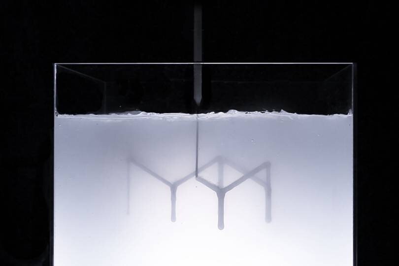 В последние несколько лет 3д печать плотно вошла в наш обиход и уже не кажется чем то и ряда вон выходящим. И года не проходит без новости о том чтобы где то в мире не напечатали дом или автомобиль или еще какую нибудь вундервафлю. Однако есть у технологий 3д печати один существенный недостаток, так как печать происходит послойно, скорость печати как правило чрезвычайно мала. Очень оригинальным способом удалось обойти это ограничение в MIT’s Self-Assembly Lab. Они предложили метод печати в среде поддерживающего геля. Расплавленный материал подается с помощью иглы в плотный гель, который поддерживает структуру во время печати. По словам Джареда Локса, одного из директоров MIT Self-Assembly Lab «Гель похож на гель для волос или дезинфицирующее средство для рук и выполняет две ключевые функции. Первая состоит в том, что он может подвешивать объекты, чтобы мы не боролись с гравитацией и не нуждались в послойной печати или печати поддерживающих структур, печать которых занимает много вр