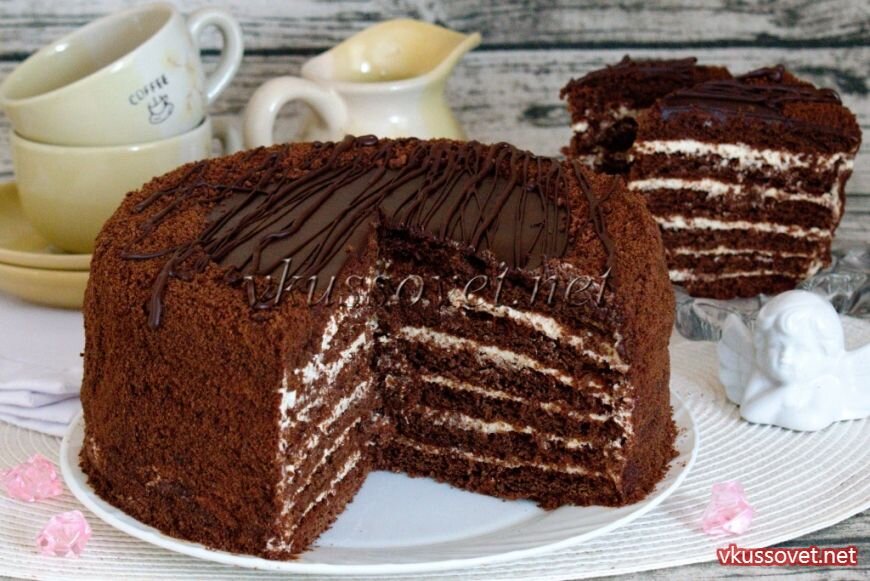 Рецепт приготовления торта Спартак в домашних условиях. Торт Спартак – это десерт, который состоит из нескольких шоколадно-медовых коржей с заварным кремом. Еще никто не оставался равнодушным после дегустации такого мягкого и нежного тортика. Несмотря на кажущуюся сложность приготовить его самостоятельно вполне реально. Конечно, придется с ним немного повозиться, но ради результата всё-таки стоит попробовать и побаловать своих близких. В классическом варианте торт Спартак — это практически тот же медовик, но с добавлением в тесто, помимо меда, еще какао-порошка, сверху он покрывается шоколадной глазурью. Традиционный заварной крем с добавлением сливочного масла можно так же разнообразить, заменяя масло, например, на сметану. Необходимые продукты: Для теста: 60 г меда; 150 г сахара; 2 яйца; 1 ч. ложка соды; 40 г какао-порошка; 90 г сливочного масла; 400 г муки. Для крема: 700 мл молока; 7 ст. ложек муки; 2 яйца; 150 г сахара; 180 г сливочного масла (размягченного). Для г