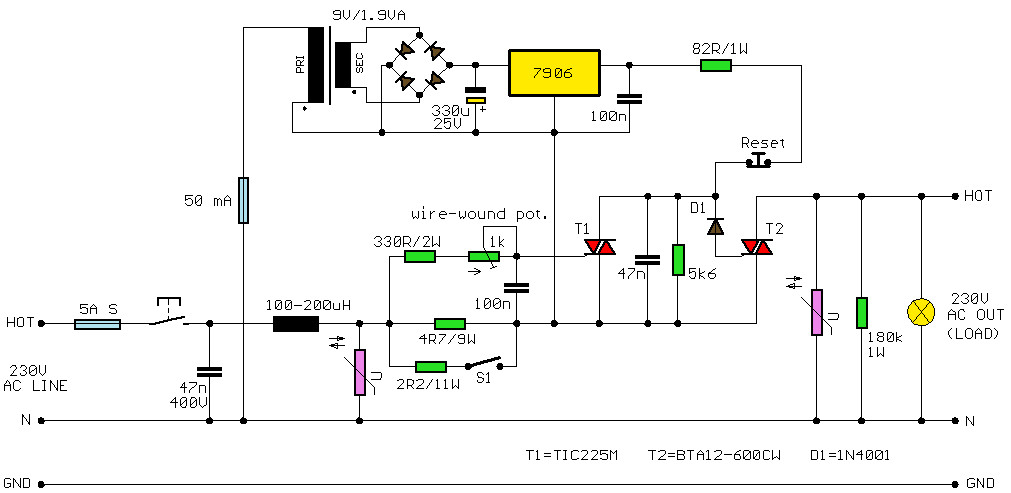 Быстродействующий электронный предохранитель с регулируемым током срабатывания предназначен для работы в цепи переменного тока 230 В. Описание Когда ток через нагрузку превышает уровень, определенный положением движка проволочного подстроечного резистора (1 кОм), схема немедленно отключает нагрузку. Если S1 разомкнут, ток срабатывания приблизительно 300…650 мА, и 0.8…2 А, когда замкнут. Ключевая особенность устройства – использование падения напряжения на мощном резисторе, включенном последовательно с нагрузкой. Это падение напряжения прямо пропорционально току нагрузки. Когда ток мал, напряжение на датчике-резисторе также мало и недостаточно для отпирания T1. Одновременно, вентиль T2 запитан от маломощного источника отрицательного напряжения, выполненного на стабилизаторе типа 7906. T2 открыт и нагрузка подключена. Если ток через нагрузку становится слишком большим, падение напряжения на резисторе увеличивается и открывает T1 (через резистор 330 Ом и подстроечный резистор). T1 начи