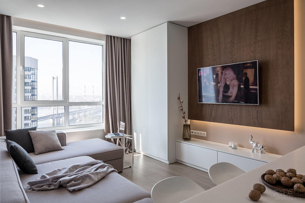 Стоимость ремонта данной квартиры указана за все, это значит включая отделку, мебель, встраиваемую технику и т.д. По словам дизайнера такая высокая стоимость обусловлена тем, что маленькая квартира совмещает в себе по сути несколько комнат. Общая площадь составляет 28 м², соответственно общая стоимость 28 000$.