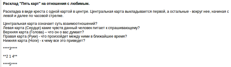 Кверентка. А можно "Пять карт на отношения с любимым"? Я. Раскладываю. Я. П.1, суть отношений - Политика. Обманчивая, может казаться, что все хорошо, но пока это лишь кажется. Кверентка. Ну да, всё шатко. Или, может, у каждого свое видение наших отношений, и мы пытаемся договориться. Я. Да, может быть и так. П.2, какие чувства человек питает к вам - Шут. Сам еще не понял, для него это слишком ново и необычно. Кверентка. Второй пункт - подходит ваше описание. Я. П.3, что он о вас думает - Прорыв. И тут нет определенности, его мысли могут резко меняться. Кверентка. Да, так и есть. Бросает в разные крайности. Я. П.4, что произойдет между вами в ближайшее время - Молчание. Ничего, будет так же непросто, как сейчас. Кверентка. Наверное. Я. П.5, к чему все это приведет - Замедение. Отношения возможны, но будут развиваться медленно. Кверентка. Наверное, так и есть. Непонятно только, стоит ли мне проявлять инициативу. Я. Это отдельная тема, сможем ее разобрать в следующий раз, если захотите. К