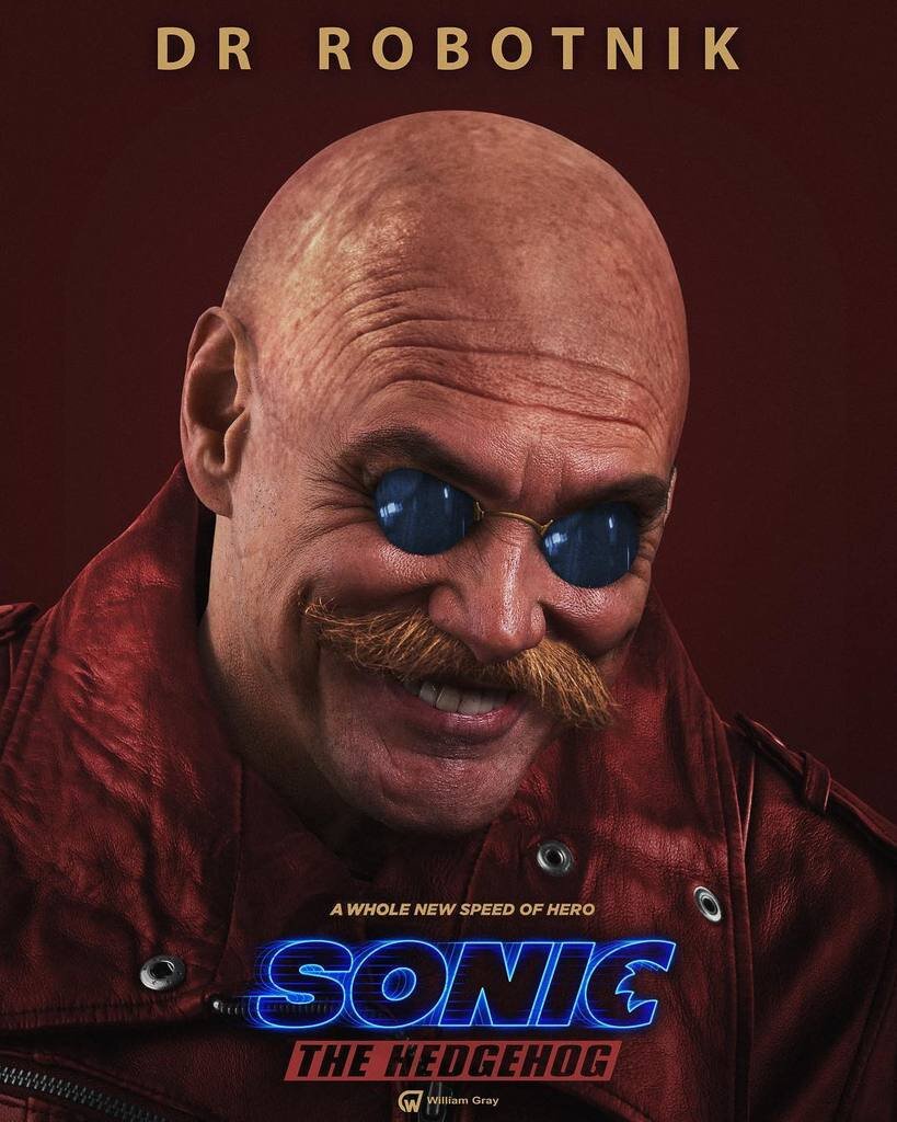 Ставь лайк и подписывайся на свежие новости! Не так давно началась маркетинговая кампания грядущего фильма про Соника, который будет называться "Соник в кино". Стало известно, что главного злодея, доктора Эггмана, сыграет популярный голливудский актер Джим Керри. В сети уже появился арт, показывающий актера в образе. Многие сразу отметили потрясающее сходство со внешностью Эггмана из мультфильмах. Также можно не сомневаться, что Джим Керри сможет скопировать его повадки и прекрасно передать характер героя с экрана. Также уже подтверждено, что Джеймс Марсден сыграет Тома Вачовски - напарника Соника. Актер известен своими ролями в сериале "Мир Дикого Запада", в фильмах Люди Икс, а также "Трасса 60". По сюжету киноленты, Соник объединится со своей командой, чтобы остановить доктора Эггмана, желающего захватить мир. Возможно, злодей нападет на Землю, используя своих роботов, как это было в мультфильмах. Также недавно был опубликован анимированный постер, помогающий оценить облик ежа. Сраз
