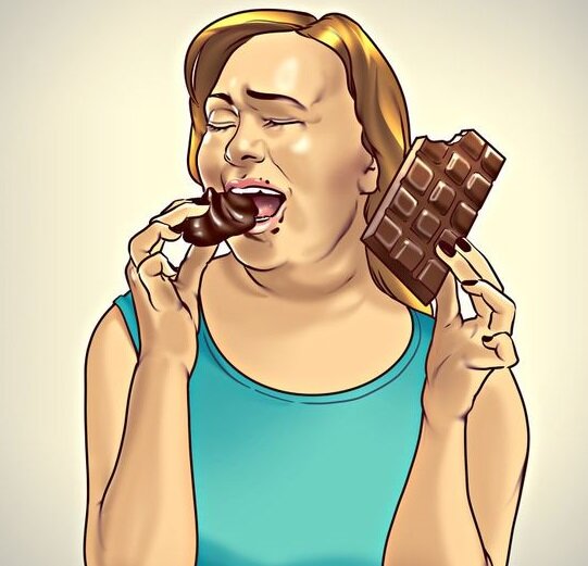Психологическая зависимость от еды – проблема человека последних столетий. Огромное количество всевозможной еды давит со всех сторон одновременно. Красивые люди едят красивую еду на экранах телевизоров и изображениях с рекламных щитов. На каждом шагу кафе и рестораны, окутанные дымкой приятных ароматов. Полки продуктовых магазинов просто ломятся от различных вкусностей в красивых обёртках и красочных упаковках. Культ еды завладел человеком. Где бы он ни находился, чем бы ни был занят – еда повсюду. Попкорн в кинотеатре, кофе с пирожным на дружеской встрече, соблазнительная булочка в витрине пекарни на пути домой. Как же избавиться от этого наваждения? 1. Нужно научиться переключать внимание с желания поесть на более конструктивные занятия. Беседу с другом из кафе следует перенести в парк, заменив тем самым бездумное жевание на полезную прогулку. Захотелось съесть необычайно вкусный и красивый торт из соседней кондитерской – комплекс физических упражнений за пару подходов отобьёт желан