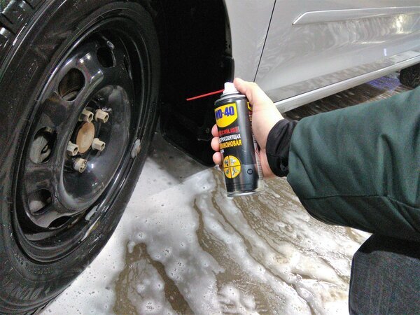 Я избрал не просто WD-40, а силикон от этой же фирмы, далее оставалось только дожидаться момента, когда можно помыть автомобиль, и вот около недели назад немного потеплело ночью обещали максимально -4 и я отправился на мойку, шибко усердствовать я не