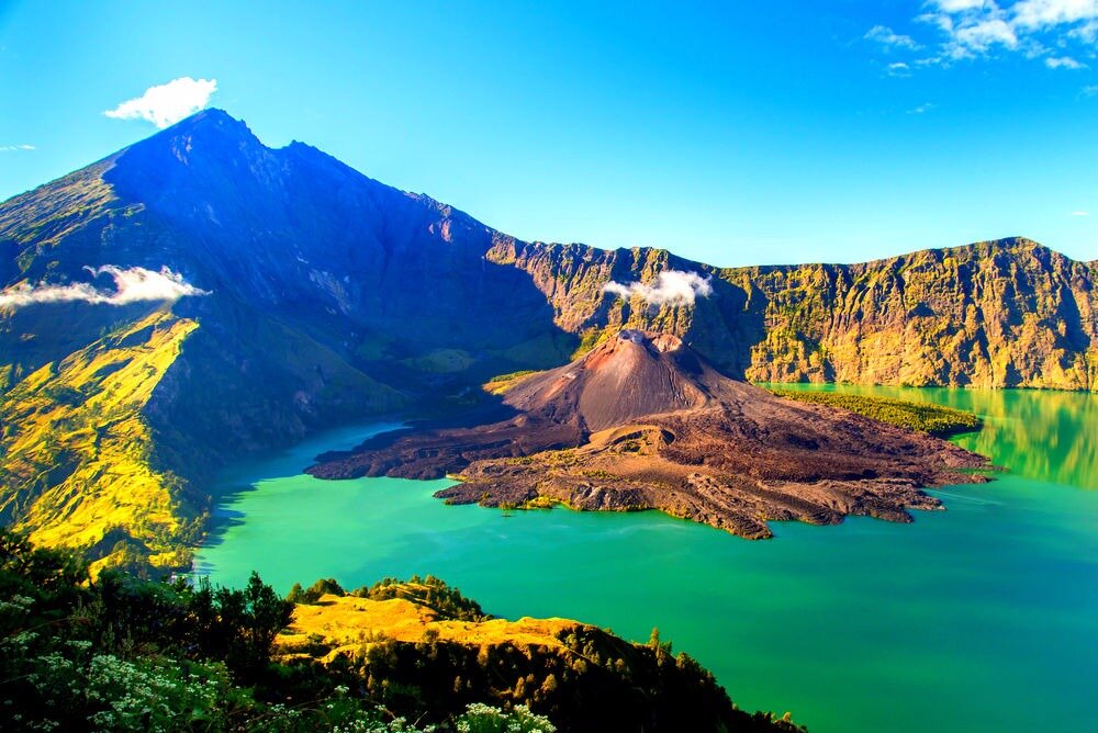 Один из самых высоких вулканов Индонезии называется Ринджани и находится на острове Ломбок. Его довольно внушительный кратер овальной формы 6,5 на 8 километров вмещает небольшое, слегка дымящееся сопло, огромное озеро и горячие источники. С апреля по декабрь, то есть в сухой сезон, когда осадков выпадает мало, жители района Сенару у подножья вулкана организуют для туристов трёхдневный трекинг на вершину. Группы набирают небольшие, до 8 человек на одного гида, и самая прелесть похода в том, что палатки, спальники, воду, еду и горелки несут портеры (носильщики), вам же надо взять с собой только тёплой одежды и перекусы, например, орешки, сухофрукты и шоколад.