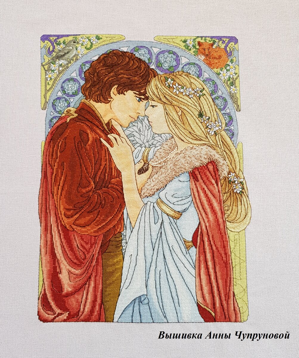 Без лишних слов! Вот эта прекрасная вышивка по авторской схеме. Лицо и тело я как обычно отшила петитом. Я всегда предварительно эти места перенабираю в ПМ, корректирую границы, делаю мягче переходы и отшиваю петитом. Точнее полукрестом в 2 нити через одну ниточку основы, так как используются блэнды. Вот так выглядит мой перенабор в программе: В данной вышивке я полностью петитом отшила пёрышко-украшение на шее девушки, а так же цветы в волосах. Петиты, 1/4 и 3/4 креста я использую на стыках контрастных цветов, чтоб они не вылезали за бэк. И кончики кудряшек мужчины, где они спадают на лицо, так же подгоняла под бэк, так как цвет волос мужчины контрастный. Цвет глаз поменяла. Сделала их зелёно-голубыми. А так же на моем канале Ютюб есть видео о данной вышивке. И ссылочка на канал есть в профиле!
