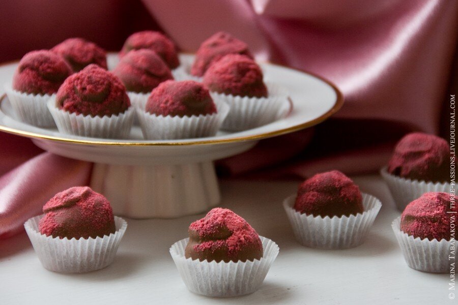 · 2 столовые ложки сахарной пудры Как готовить 1. Поместите шоколад в жаропрочную миску . 2. В маленькой кастрюле довести взбитые сливки до кипения. Налейте сливки в миску с шоколадов и дайте постоять 5 минут. 3. Взбейте смесь до получения однородной массы. Добавьте малиновое варенье и взбейте до однородной массы. 4. Поместите в холод, пока не примет консистенцию, которая позволит придавать форму конфетам. 5. В маленькой миске смешайте какао-порошок и сахарную пудру. 6. Формируйте шарики, обкатывайте их в сахарной пудре и выкладывайте на блюдо. 7. Готовые трюфеля охладите в холодильнике до готовности.