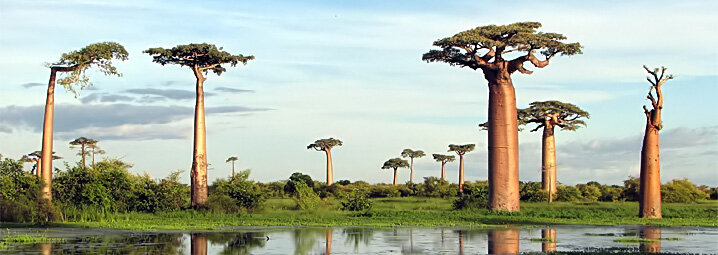 В африканских странах баобаб символизирует жизнь и является хранителем земли, потому что это самое долгоживущее дерево да ещё и необычайно жизнеспособное. Огромные корни его растягиваются по поверхности земли, занимая в округе большущее пространство. Такое мощное корневище необходимо дереву для обеспечения влагой. Вся жидкость, которая впитывается как губка, хранится в непропорционально широком стволе баобаба, который является резервуаром влаги и питательных веществ. Пузатенькие стволы, способные вместить до 120 тысяч литров воды, помогают выжить во время сильной засухи. Некоторые стволы такого огромного размера, что внутри могут жить одновременно несколько видов небольших животных, птиц и насекомых. Цвести баобаб начинает в двадцатилетнем возрасте. Большие белоснежные цветы дерева живут всего одну ночь. Распускаясь вечером, они источают приятный мускусный аромат, а к утру постепенно увядают. Плоды дерева созревают в больших стручках, формой похожих на манго. Баобаб - просто универсаль