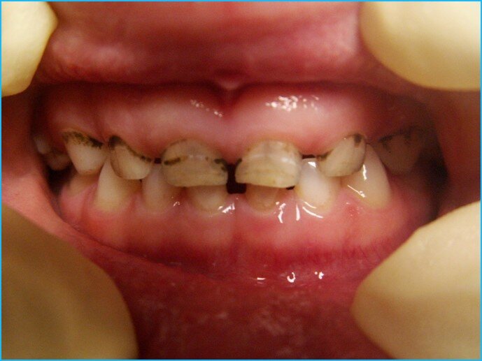 Детские зубки больше подвержены разрушениям, чем взрослые. В этом ничего нет диковинного, ведь молочные зубки не предназначены для пережёвывания «взрослой» обычной пищи. А чёрные участки на зубках, чаще всего именно кариес. Но запускать состояние кариеса никак нельзя. Это может дать довольно серьёзные осложнения. Не стоит сразу огорчаться, что у малыша есть такой недостаток. Кариес легко лечится у детского стоматолога, а в крайнем случае зубки всё равно поменяются. То, что малыш сейчас подвержен атаке кариесом, ещё не говорит, что с коренными зубами будет такая же проблема. Изредка почернение может возникнуть из-за внутренних проблем организма. Допустим, переизбытка железа или грибковой бактерии. Выяснить это можно только у врача, поэтому не откладывайте визит, чтобы не погубить здоровье ребёнка. Для родителя важнее всего обучить кроху всем премудростям ухода за полостью рта. И сделать это следует так, чтобы для ребёнка это было не просто ежедневной процедурой, а важным и любимым заня