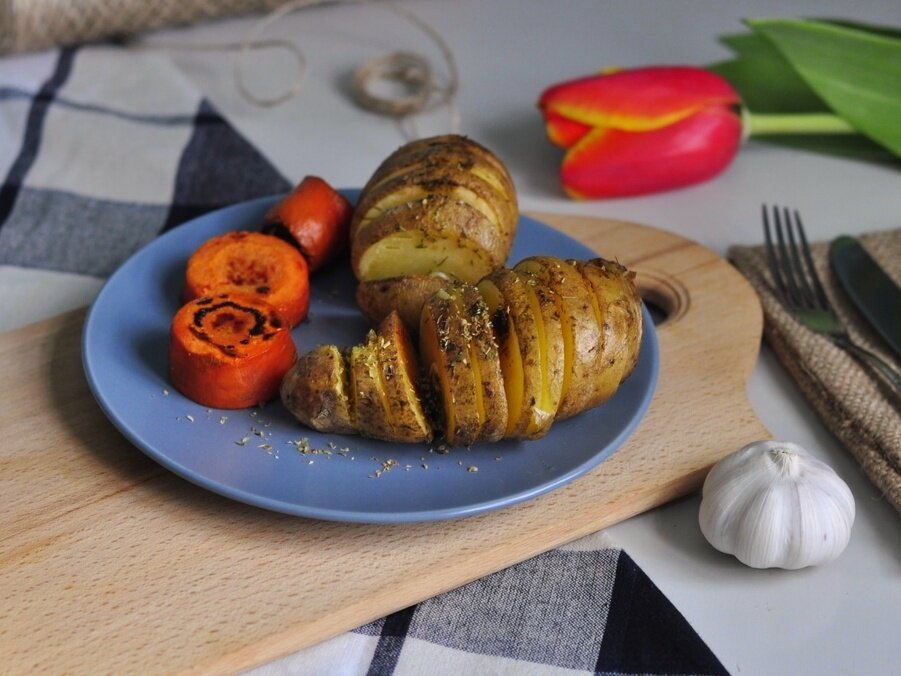 Все вкусное обязательно должно быть сложным в приготовлении? Ингредиенты: - Крупные клубни картофеля, - чеснок, - сливочное масло, - морковь, - соль, перец, смеси трав - по вкусу. Шаги приготовления: 1. Картофель очень хорошо моем. Обсушиваем кухонным полотенцем. Делаем надрезы через каждые 3 мм почти до основания. 2. Картофель промазываем в разрезах растопленным сливочным маслом. Для этого подойдёт кулинарная кисточка. 3. Хорошо солим, перчим и посыпаем любимыми травами. Чеснок режем на слайсы и вставляем в картофель. 4. Морковь чистим, моем, режем средними кусочками, солим и перчим. 5. На пергамент раскатываем наши овощи. Выпекаем 45 минут в разогретой до 190-200° духовке. Подавать горячим, сверху на картошечку отлично положить при подаче небольшой кусочек сливочного масла. А для гурманов - за 10 минут до готовности посыпьте картофель тёртым твердым сыром. Он там не помешает! Понравился рецепт? Поставь палец вверх?