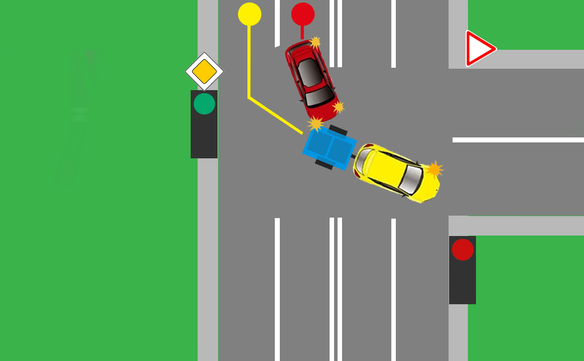 Водитель красной машины решает повернуть на перекрестке налево, тогда как авто с прицепом тоже решает совершить поворот налево. Траектории их пересекаются, машины соприкоснулись. Вопрос в том, на кого свалят всю вину?