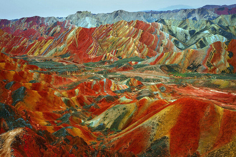 Похоже на картину или фотошоп,не так ли? Знакомьтесь : Цветные скалы Чжанъе Данксиа Расположены они в Национальном геопарке Чжанъе Данься, или геопарк же просто геопарк Данься. Раньше это был просто парк в провинции,но в 2011 году получил статус национального геопарка Китая. Китайские СМИ считают это место одним из самых красивых ландшафтных образований своей страны. Лично мне кажется, что это одно из самых красивых и необычных место не только в Китае,но и в мире. Разноцветные холмы - это результат выветриваний,эрозия,движения Земной коры , происходивших в течение миллионов лет. Глядя на фотографии скал,кажется ,что смотришь на работу профессионального художника, который из красок от алого до небесно-голубого смог написать этот шедевр. Все скалы,холмы,пещеры и другие формы рельефа в основном состоят из такой горной породы как красный песчанник. Расположено это место поблизости от города Чжанъе в китайской северо-западной провинции Ганьсу . Посетить это место довольно недорогое раз
