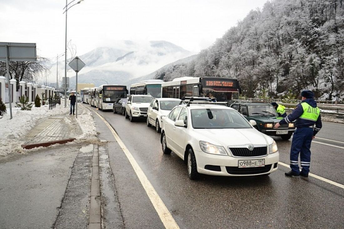 В целях предупреждения дорожно-транспортных происшествий на пути к горнолыжным курортам Красной Поляны сотрудниками ДПС организованы посты, где осуществляется проверка оборудования автомобилей зимними шинами. Несмотря на субтропическую зиму в Сочи, аварий на дорогах не становится меньше. Некоторые автолюбители предпочитают не менять летнюю резину на зимнюю даже сейчас, когда этого требует Федеральный закон. Он действует с первого декабря, когда весь автотранспорт в стране должен ездить на шинах, приспособленных к гололеду – на шипованой резине или так называемой «липучке». Таким образом, водителям, которые не «переобули» свои авто на зиму, не позволят проехать к курортам Красной Поляны