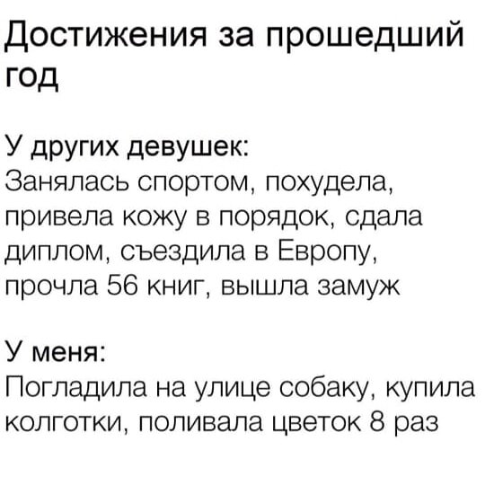 4 января.... подведение итогов или планы на 2019 год! Какие итоги за 2018 год может подвести девушка 26 лет от роду с непонятной зелёной маской на лице ( которая обещает ....ну просто волшебное очищение лица), так же не забываем про волшебный бокальчик красненького сухого. Так как 2018 год отлюбил меня как мог и весь год прошел под мнимым ощущением оптимизма, выдохнуть и поверить что все закончилось я увы не могу. За 2018 год провалены все сферы жизни. Итак: -на шпагат я не села ( не больно то и хотелось); -мой рацион не стал (как это называют в Инстаграмм) ПЭПЭ; -единственные физические упражнения мозгом на работе 24/7; -меньше кофе и сигарет не стало от слова "совсем" (хотя тоже не больно то и хотелось). Судя по списку к идеалу я не приблизилась ни на метр, куда уж метр...ни на сантиметр! Ах да...ещё одна сфера жизни ( мы женщины ее просто ходим и лелеем) это личная жизнь! В 2019 я вошла как в грешную жизнь ( люблю песни Меладзе) без пайеток, платья и без тонны золотого хайлайтера