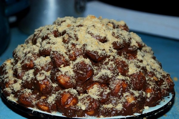Несомненным достоинством этого десерта является простота его приготовления. Ингредиенты: мука пшеничная – 450 г; сахар – 10 ст. л. без горки масло сливочное – 165 г; сметана, жирность 15%- 100 г; какао-порошок - 100 г яйцо – 3 шт.; разрыхлитель- 1 пакетик орехи – ½ стакана; молоко – 600 мл; соль – щепотка. Способ приготовления: На водяной бане растопить 100 грамм сливочного масла и дать ему остыть. Взбить миксером 1 яйцо с 6 ст.л. сахарного песка. Добавить сметану, растопленное масло, всё хорошенько взбить до однородной консистенции. Добавить разрыхлитель, соль, 350 грамм просеянной муки. Перемешать, замесить тесто. Отщипывая небольшие кусочки теста, скатать шарики, размером с грецкий орех. Выкладывать шарики на небольшом расстоянии друг от друга на противень, застеленный промасленным пергаментом. Отправить в разогретую духовку до 180 градусов на 20 минут. Затем снять с противеня и дать им остыть. Взбить миксеро