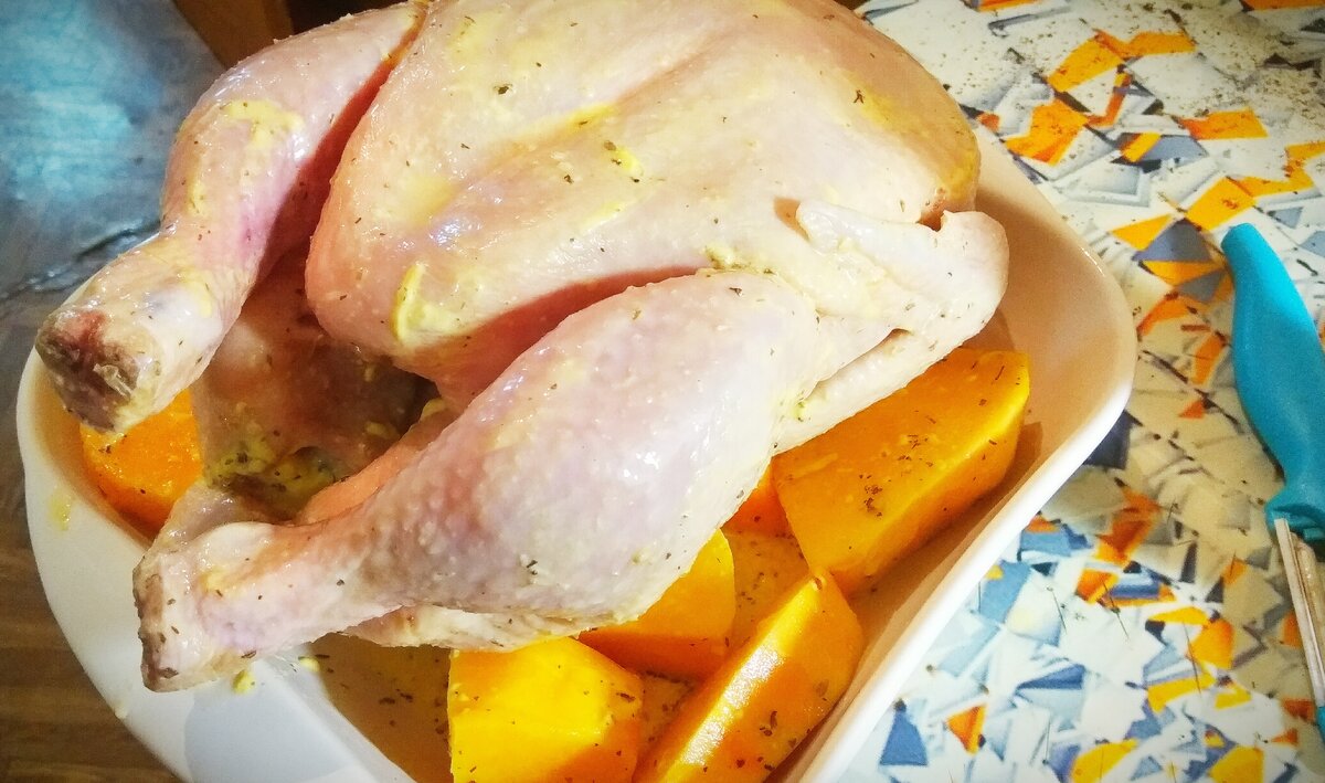 Это блюдо украсит любой стол, а гости удивятся тому, что в его составе есть тыква! Из предыдущих статей вы уже поняли, что в этом году у моей матери на даче урожай тыквы и кабачков. И, так как гостинцы прилетают регулярно, приходится думать, что с ними делать. Этот рецепт подойдет и для тыквы, и для кабачков. Хотя с тыквой вкус получается намного более насыщенным. Нам понадобится: Готовить легко и быстро, приступим: 1) Тыкву чистим от корки и внутренностей, режем крупными кусками, кладем в глубокую кастрюлю или тазик. Туда выдавливаем наш соус, или майонез, или наливаем масло, кладем специи, соль и чеснок, измельченный с помощью пресса или в виде сухой приправы. Все перемешиваем. 2) Цыпленка моем снаружи и изнутри. Изнутри натираем солью и приправами. Затем натираем снаружи тем, в чем "замочена" наша тыква. 3) Выкладываем на противень с высокими стенками сначала тыкву, а сверху - цыпленка. Можно закрепить ножки зубочисткой или связать друг с другом. 4) Ставим запекать примерно на 200
