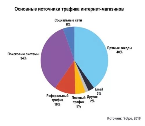 Поисковые системы являются одним из важнейших источников трафика для интернет-магазинов. Компания Yotpo проанализировала 65 млн заказов из 120 тыс. интернет-магазинов по всему миру. Поисковые системы приводят на коммерческие сайты 34 % покупателей, тогда как социальные сети и email только 6 % и 3 % соответственно.