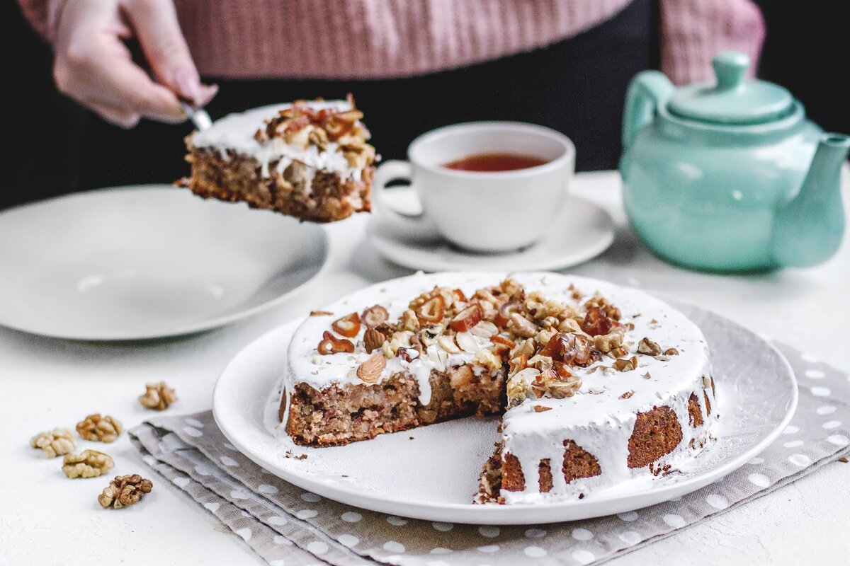 Вы когда-нибудь пекли торт без муки? Нет? Тогда пришло время экспериментов. Джамиля — сладкий десерт, абсолютно восточный. Тут и финики, и орехи. И хрупкая белая глазурь. Его происхождение — загадка. Должно быть, некий влюбленный кондитер посвятил сладость прекрасной девушке по имени Джамиля. Посвятите и вы немного времени этому ароматному торту. Тем более, что лучшей пары к чаю не найти на всем Востоке! Финики 150 г Грецкие орехи 100 г Миндаль 100 г Масло сливочное 70 г Яйца 4+1 шт Мед 20 г Сахар коричневый 130 г Ванильный сахар 1 уп Крахмал 50 г Апельсиновый сок 50 мл Сахарная пудра 100 г Лимон 0.5 шт Форма алюминиевая круглая 1 шт Время приготовления 50-55 мин. + 40 мин. для застывания глазури.