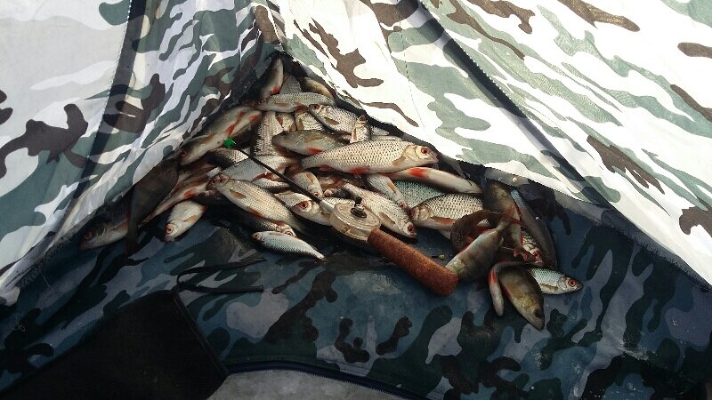 Статья на портале РНарод Всем привет. Теперь точно закрыл этот сезон. Сегодня утром я спал не предвещая ничего. Тут вдруг звонок, который неожиданно пробудил меня. Звонит дядька и зовёт на рыбалку. Лес после оттепели весь облеплен инеем. Приехали на среднюю речку близ впадения в вдх. Нас четверо и ещё один знакомый уже на воде. Быстренько забуриваемся на максимальной глубине в этом месте, около 3-х метров и ставим палатки. На улице не холодно, но в палатке ловить комфортней. Цель крупная плотва. Здесь есть экземпляры и пол кило. Пока не было такой рыбалки чтоб я возвращался без оторванных мормышек. А сегодня был именно такой день. Крупняка не было вообще. В основном живец и немного средней плотвицы. Вначале ловил со дна на наживку. Потом в пол воды, а потом и на безмотылку перешёл. Моменты прям подо льдом собирались стайки окунь и жадно атаковали безмотылку. Сегодня лучше всего отработал сырный гвоздекубик. Так же неплохо плотва ловилась на поплавочную оснастку. В ходу были все виды