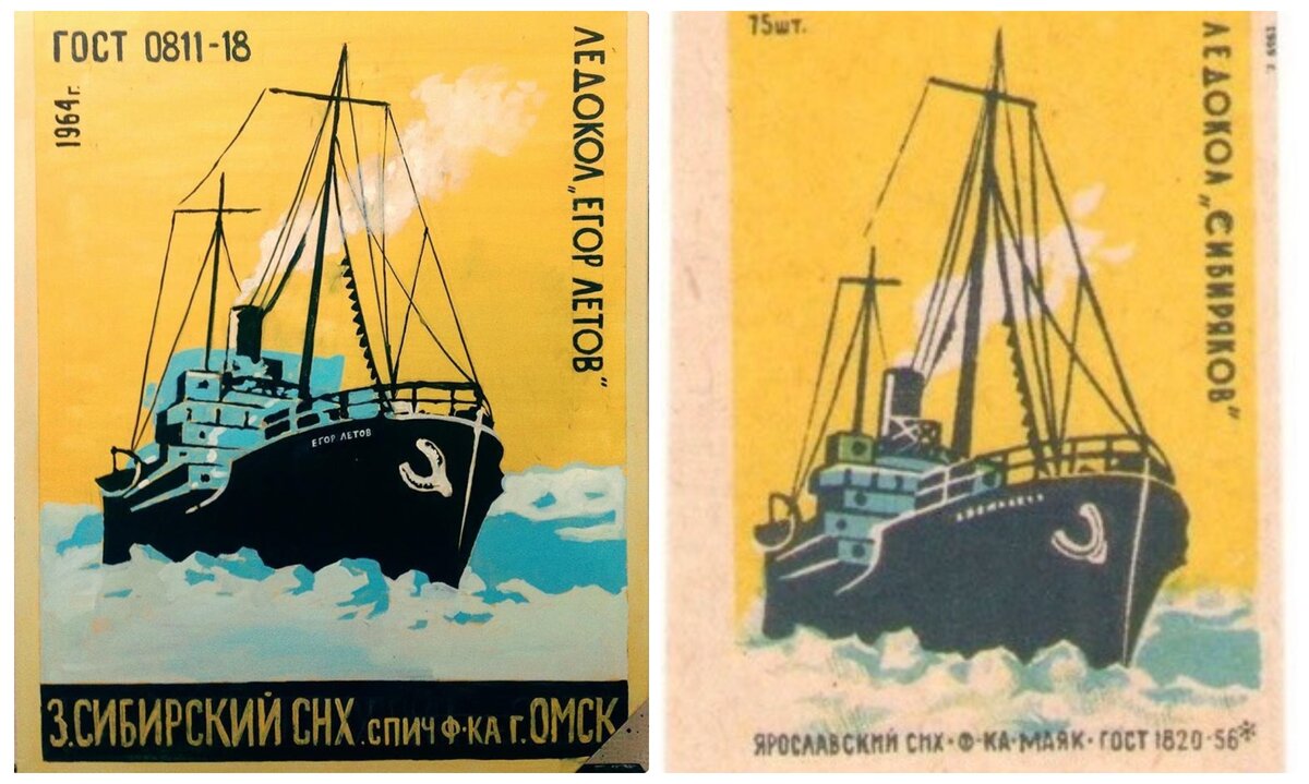 Известный омский художник Дамир Муратов в ответ на решение организаторов конкурса “Великие имена России” вычеркнуть имя Егора Летова из списка кандидатур на переименование Омского аэропорта назвал в его честь ледокол. Произведение стилизовано под этикетку спичечного коробка, из серии “Ледоколы”, выпускавшуюся на Свердловской и Ярославской спичечной фабрике в 1959 и 1960 гг (на произведении художника указан год рождения Егора Летова). А в указанном госте зашифрован день рожденья группы Гражданская оборона. В оригинале на этикетке был изображен ледокол “Сибиряков”.