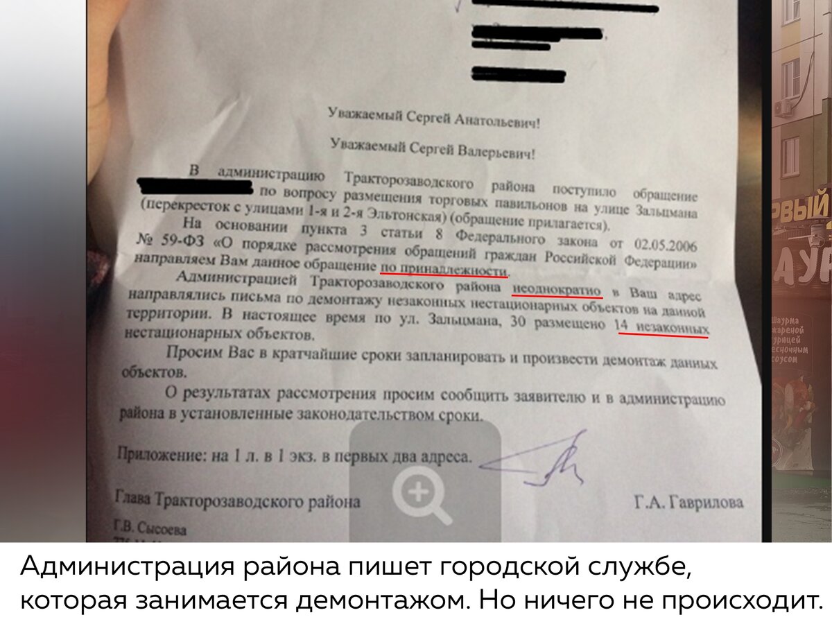 Наша подписчица прислала ответ на её обращение с просьбой убрать нелегальный бизнес из под окон её дома — район прислал копию своих писем. У районных чиновников нет полномочий сносить ларьки — это может делать только специальная служба МКУ «Городская среда». Ей выделяют деньги из бюджета, чтобы она увозила ларьки на штрафстоянку. Но скорость работы этой организации создаёт вопросы. Почему ничего не происходит? Что нужно, чтобы ситуация исправилась? Пока мы рисуем красивые картинки про Челябинск-2020, спальные районы города заполняются нелегальной торговлей и антисанитарией. Хуже всего, что уродский облик районов из-за орды ларьков ухудшает качество жизни горожан. В организации процессов внутри челябинской администрации что-то явно не так. И если город временно без головы (идёт назначение мэра), то кто может повлиять на ситуацию? К кому идти на разговор горожанам? Кстати, а что депутаты? Алло! Вы где спрятались? Продолжайте бомбить администрацию жалобами, это важно. Мы написали все адре