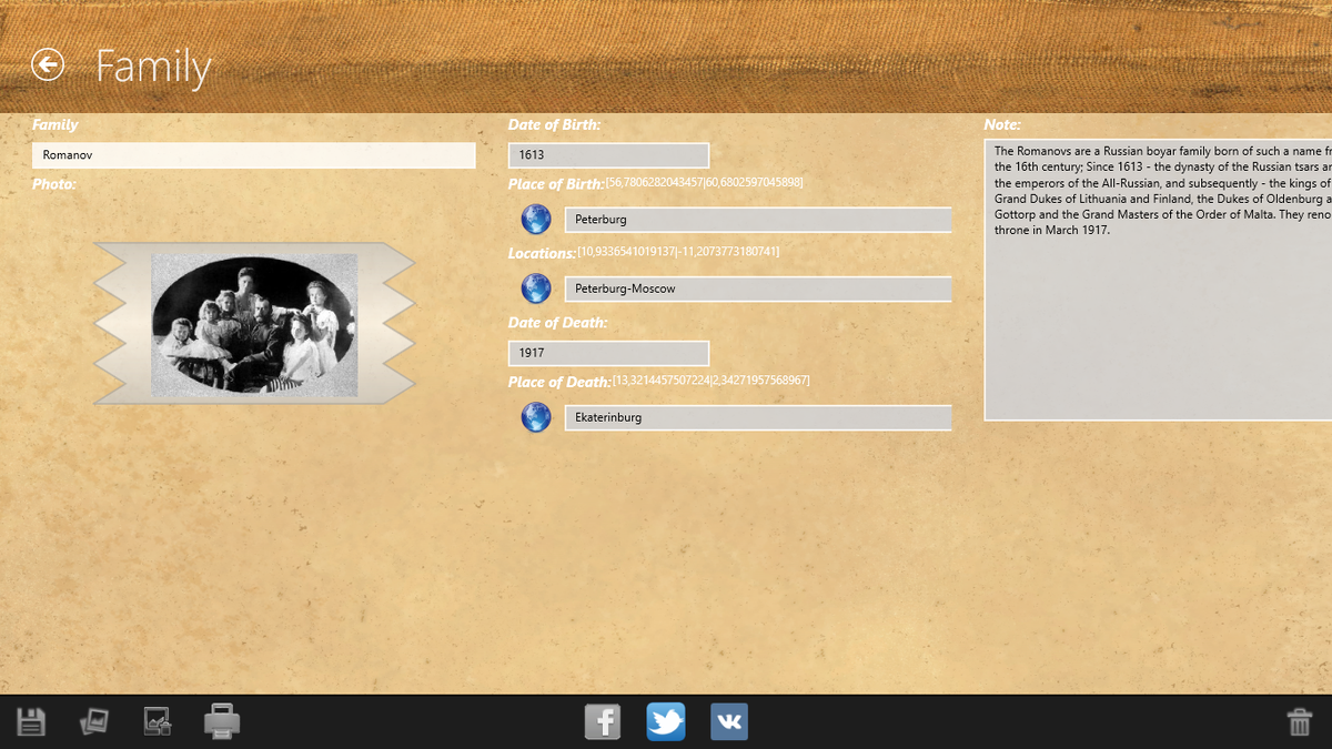 Feel yourself a Researcher of your kind with the program Family trees. The program creates a list of families and family composition, it is possible to create order in the lists of persons. It is designed to store family history and build a genealogical tree. On the basis of the coordinates of the place of birth of persons is a genealogical map of the family.