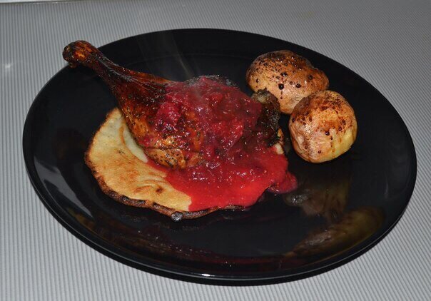 Цитрусовая утка на пресном оладушке с бруснично-винным соусом и запеченным картофелем