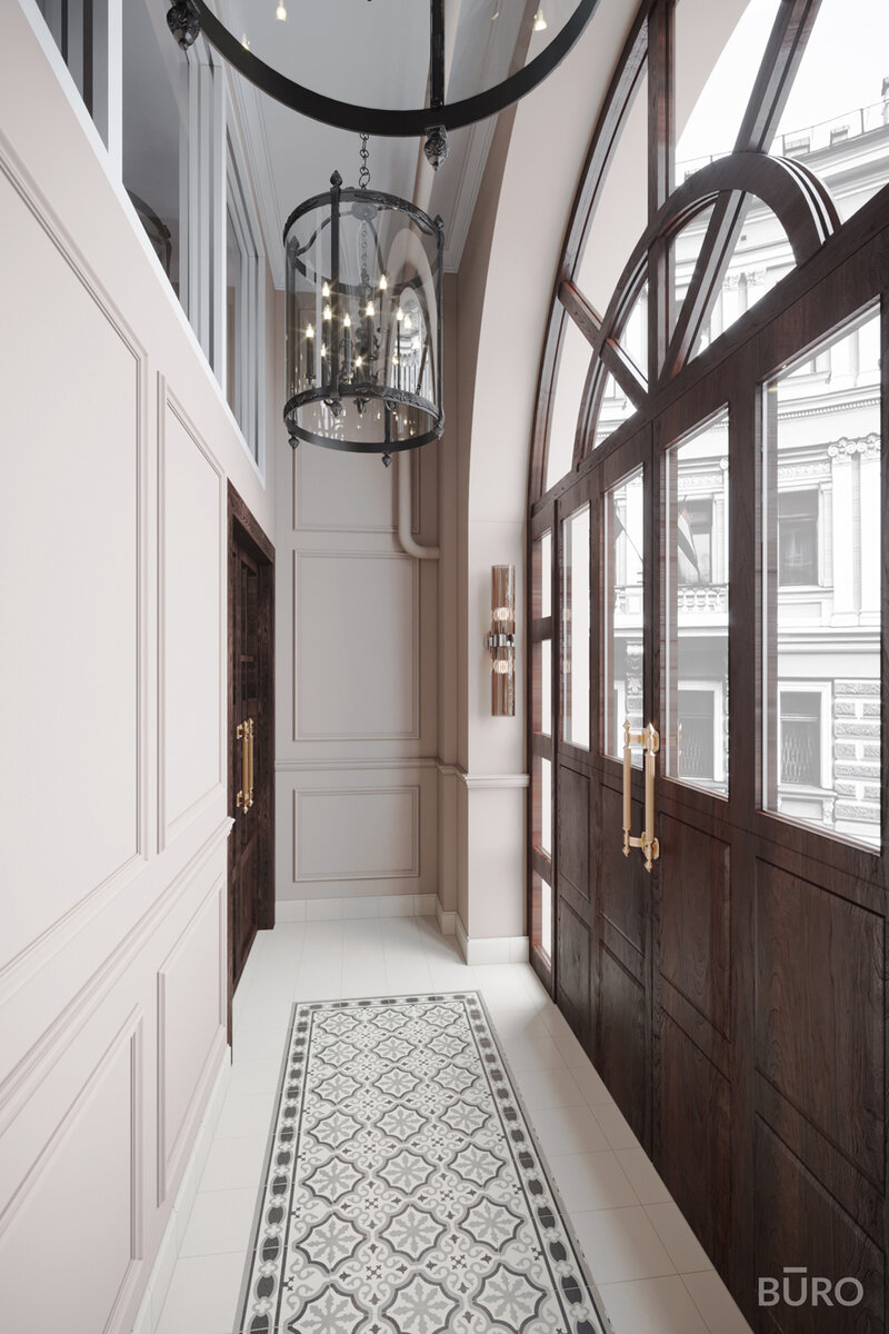 Площадь парадной – 223 м² Количество квартир – 16 ПАРАДНАЯ В НЕОКЛАССИЧЕСКОМ СТИЛЕ Такой проект мог случиться только в Петербурге — дизайн интерьера парадной. Он был разработан для дома в историческом центре города. Для интерьера парадной в неоклассическом стиле мы выбрали массивные деревянные двери и стойку рецепции, окрашенные в пастельные тона стены и плитку с растительным орнаментом. Больше проектов на buroarc.ru