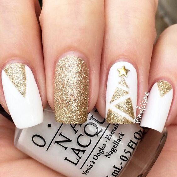 До нового года остались считанные дни и в каждом доме идут последние приготовления к пожалуй главному празднику страны. Но если у вас, как и у меня, настроение еще не очень праздничное, то исправить ситуацию нам поможет тематический новогодний маникюр. В конце концов на свои руки мы смотрим бесконечно много раз за день и не заразиться нужным настроением от красивого зимнего маникюра просто нереально - он способен быстро настроить нас на нужный лад и подарить ощущение зимнего уюта и сказки. И сегодня я хочу с вами поделиться небольшой подборкой зимних и новогодних маникюров, которыми я вдохновлялась сама и которые возможно окажутся полезны и вам. Идеи с новогодней тематикой - елка, новогодние игрушки и т.д. 1. Что может быть лучше, чем золотистые блестки, белый снежный фон и лаконичная елочка со звездой. 2. Еще одна вариация на эту тему, только с использованием страз вместо золотистого глиттера. 3. Довольно простой по дизайну ярко-красный маникюр вполне можно выполнить и в домашних у