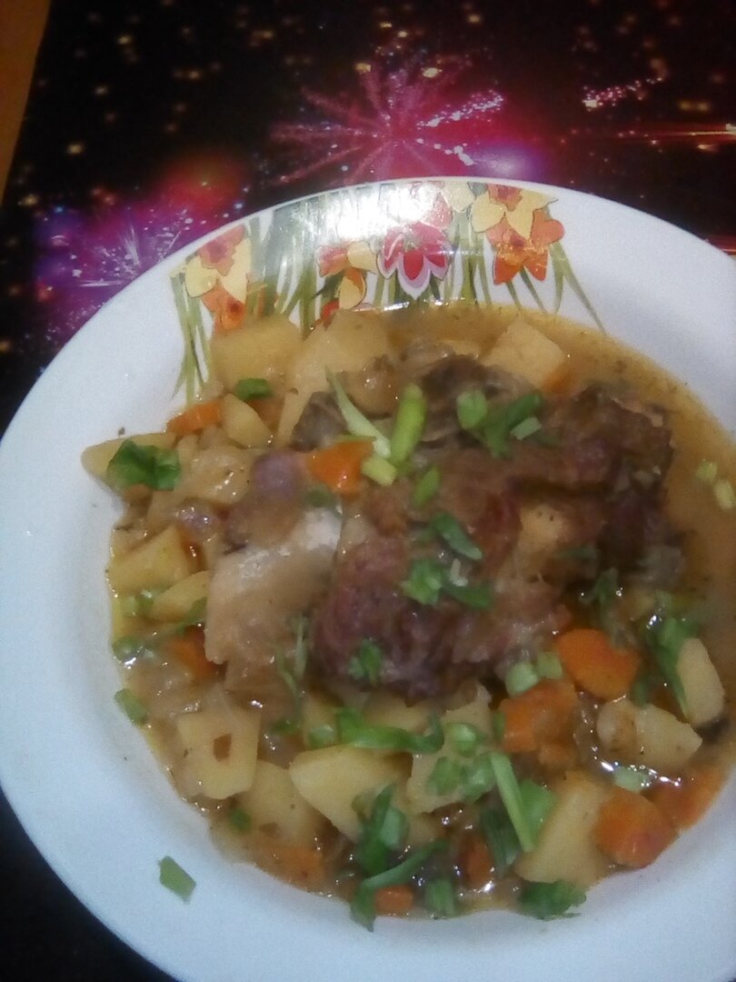 Картошка пропитанная мясным и овощным бульоном,слегка остренькая и с ароматными специями-даже не песня,а целая кулинарная симфония)