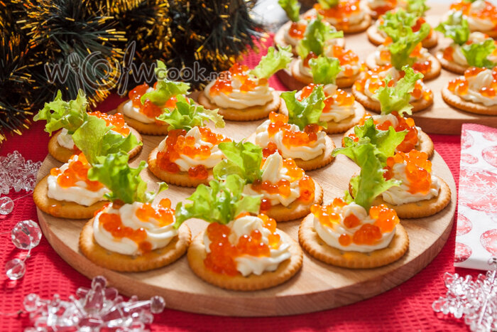 Закуска с красной икрой на крекерах готова. Приятного аппетита!
