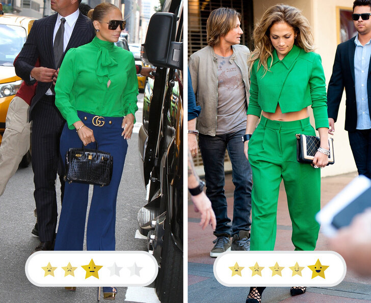1. Деление фигуры цветом Запомните: вертикаль в одном цвете всегда вытягивает фигуру и стройнит, а деление на отдельные цветные полосы, наоборот, полнит. Чем ниже рост, плотнее тело и сильный контраст цветов, тем сильнее это заметно. На фото справа Джей Ло выглядит стройнее из-за вертикали в едином зеленом цвете, а открытый живот является акцентом, привлекая внимание и отвлекая от широких бедер певицы. 2. Не так полнит цвет, как крой Слева Блейк Лайвли смотрится гораздо полнее, чем справа. Двубортный жакет, большие накладные карманы увеличили верхнюю часть фигуры, подвернутые брюки сделали ноги визуально короче. На фото справа на ней велюровый костюм с брюками полной длины, однобортным приталенным жакетом и в таком образе смотрится гораздо стройнее. 3. Черный не всегда стройнит Вроде кажется, что на Джей Ло 2 одинаковых платья, но между ними колоссальная разница. Слева платье из просвечивающего трикотажа, который подчеркивает недостатки, полосы в районе бедер, придающие объем им, п