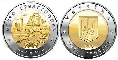 Национальный банк Украины, заканчивает серию «Области Украины» и последней вводит в обращение 26 декабря 2018 памятную пятигривневу биметаллическую монету «Город Севастополь». Монета посвящена городу со специальным статусом, городу-герою, расположенном в юго-западной части Крымского полуострова, вокруг уникальной Севастопольской бухты. Город имеет древнюю историю, уходящую корнями в глубину античной цивилизации, свидетелями которой являются руины Херсонеса Таврического — античного и византийского города. Святыня православия — место крещения киевского князя Владимира, по одной из версий, также находится на территории нынешнего Херсонеса (город Корсунь по древнерусским источникам). Выпуск данной монеты обернулся очередной «зрадой» — на монете среди прочего изображен трехмачтовый парусник. Национальные украинские специалисты по флоту обнаружили, что этот корабль — боевой фрегат характерный для Российской империи до 1855 года. По их мнению на украинской монете должно быть изображено украи