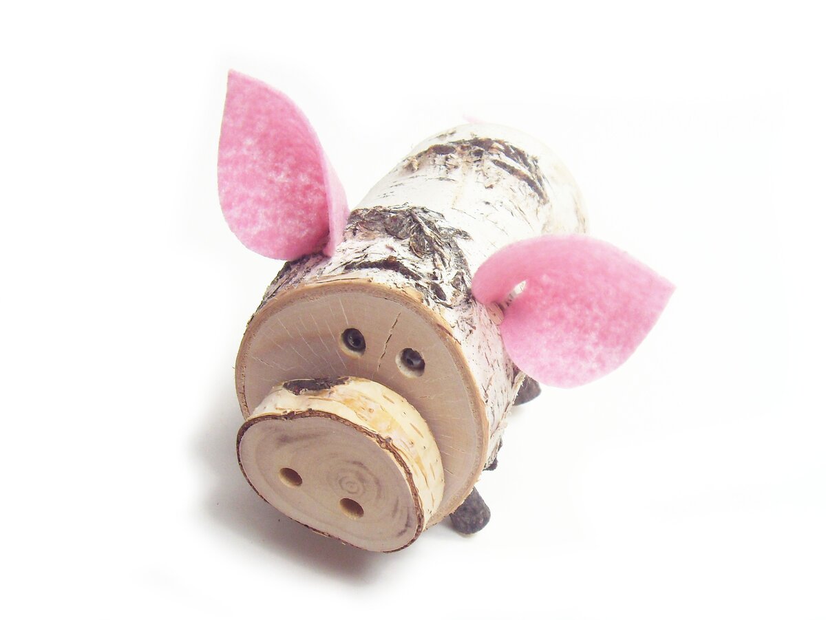 Как сделать свинку на Новый год своими руками. Вам понадобятся берёзовая чушка диаметром 8-9 см и длиной 10 см. спил от ветки диаметром 4-5 см. и четыре спила диаметром 1-1,5 см и длиной 2 см. Два самореза, четыре гвоздя. Три чопика из дерева диаметром 6 мм. Фетр на уши и хвост. Пару бусин для глаз. В чушке и в "пятачке" просверливаем отверстия диаметром 6 мм для глаз, ноздрей, ушей и хвоста. Прикручиваем на саморезы "пятачок". Снизу гвоздиками прибиваем ноги. Можно ещё и приклеить на жидкие гвозди или клей для потолочной плитки. Клапаны ушей и хвост вставляем в отверстия и закрепляем деревянными чопиками. Вставляем бусины в отверстия для глаз. Если в бусинах есть отверстия можно придать свинке определённое выражение лица. Свинка готова. А на следующий год послужит розжигом для костра или печки, когда мы будем делать новый символ года. Мы в Instagram: @milotanay_ekb