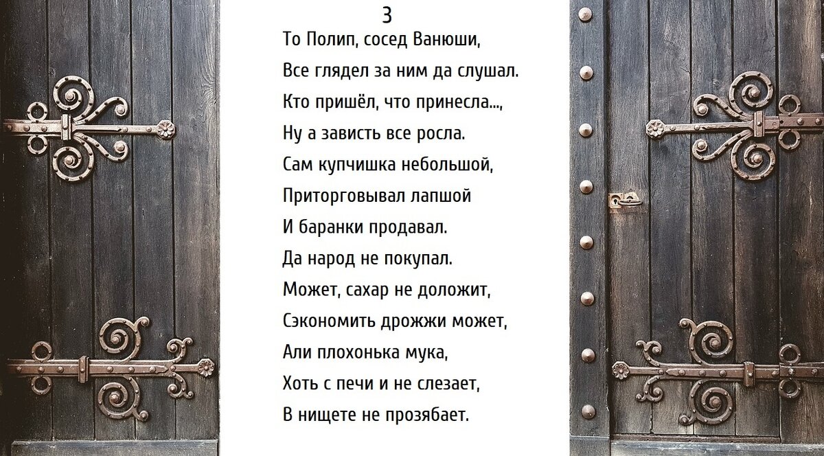То Полип, сосед Ванюши, Все глядел за ним да слушал. Кто пришёл, что принесла…, Ну а зависть все росла. Сам купчишка небольшой, Приторговывал лапшой И баранки продавал. Да народ не покупал. Может, сахар не доложит, Сэкономить дрожжи может, Али плохонька мука, Не торговля, а тоска. И к работникам не ладен, На оплату слишком жаден, Да ругает, прям беда, И бегут все, кто куда. Шуму много, толку мало. От того завидно стало, Что Иванушка сосед Сытно ест, обут, одет. Хоть с печи и не слезает, В нищете не прозябает. И Полипа думы гложат, Он спокойно спать не может, Ведь задача — стать богаче Без труда и не иначе. По ночам он тенью ходит, Планы хитрые выводит: «Ну, Ванюша, погоди! Чтой-то будет впереди».