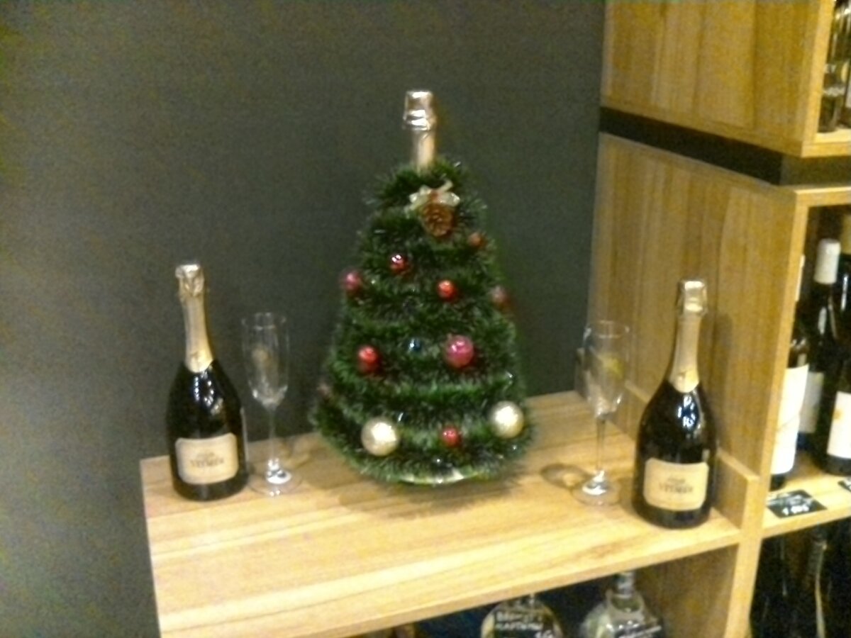 15.12.2018 собрали из бумаги, дождика и игрушек (шарики посадили на силикон). Основой ёлки послужила 3-х литровая бутылка игристого вина "Золотая Балка" Брют. Ёлу установили под уголком покупателя. Повесили снежинки. 21.12.2018 года изготовила Ирина из бумаги снежинки, я принёс деда мороза. Снежинки посадили на двухсторонний скочь.