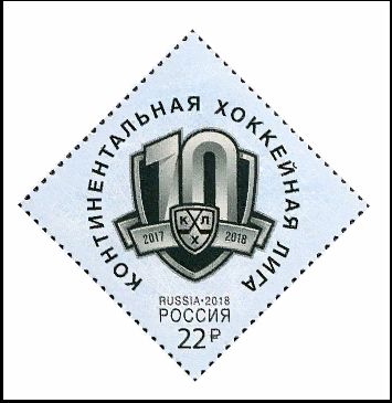 Континентальная хоккейная лига (КХЛ) — открытая международная хоккейная лига, объединяющая хоккейные клубы из России, Белоруссии, Казахстана, Китая, Латвии, Словакии, Финляндии, которые ежегодно борются за главный трофей лиги — Кубок Гагарина. Лига была образована в 2008 году и объединяла в себе первоначально 24 команды, созданная для развития хоккея на территории России и других стран Европы и Азии. Решение о ее создании было принято в феврале 2008 года. В десятом сезоне чемпионата КХЛ (2017/2018) принимают участие 27 клубов. Турнир начался 21 августа 2017 года и завершится не позднее 26 апреля 2018 года финальной серией плей-офф, по итогам которой определятся все лауреаты чемпионата. На почтовой марке изображена символика Чемпионата КХЛ юбилейного сезона. Основную часть в логотипе занимает цифра 10, подчеркивая историческую значимость предстоящего кубкового раунда. Способ печати Бумага Цвета Перфорация Формат Тираж Офсет + защитный комплекс Мелованная Многокрасочная Гребенчатая 11