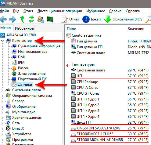 После запуска программы нам нужно открыть раздел Компьютер, затем Датчики.