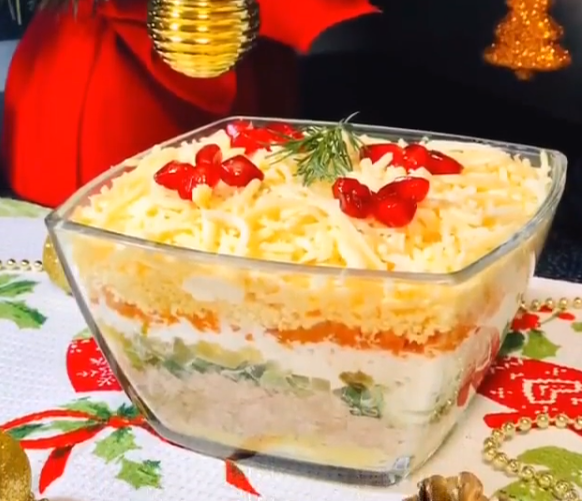 Дорогие мои, вы просили больше салатов, выполняю! Данный салат прекрасно дополнит новогодний стол, готовится просто, улетает быстро, а себестоимость салата просто смешная! Маленькая просьба, если вы собираетесь рассмотреть этот салат в качестве новогоднего блюда, поставьте в комментариях смайлик, вам не сложно, а мне приятно. Спасибо! Ингредиенты 200 гр. печени трески 250 гр. картофеля 250 гр. моркови 3 яйца 250 гр. маринованного огурца 150 гр. твердого сыра Майонез 20-30 гр. гранатовых зерен для украшения Не большой пучок зеленого лука Приготовление Картофель, морковь и яйца отварим, очистим от кожуры и скорлупы, натрем на терке в разную посуду. Так же натрем на терке и сыр, а из граната достанем зернышки. Огурцы по желанию моно нарезать кубиком либо натереть на терке. Осталось лишь собрать салат. На дно салатника кладем картофель, поливаем сеточкой майонеза, затем печень трески, мелко нарезанный лук и огурец, снова майонез, белки яиц, майонез, затем морковь, майонез, желтки, сно
