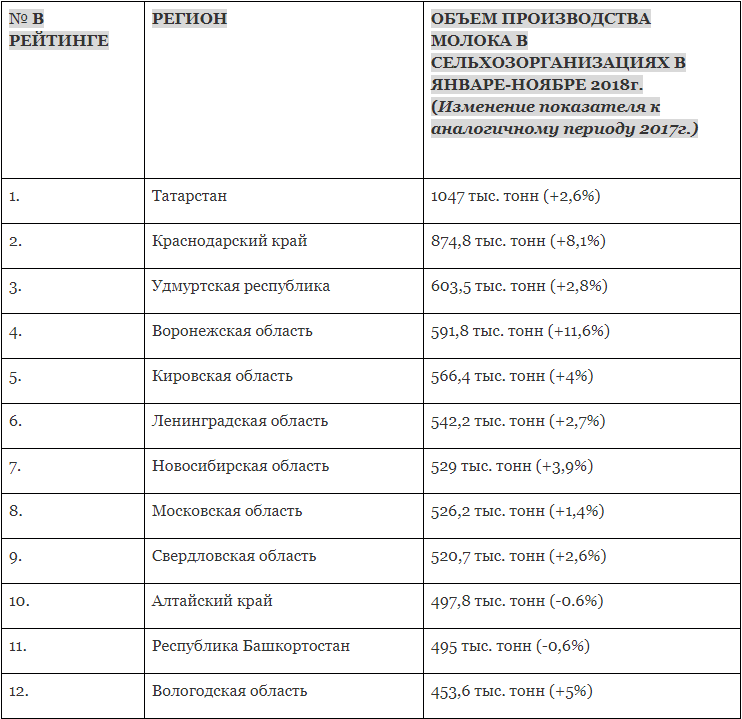 The DairyNews на основе оперативных данных Росстата публикует ежемесячный рейтинг ведущих регионов-производителей товарного молока. Тройка лидеров - Татарстан, Краснодарский край и Удмуртия на 1 декабря произвели 2,52 млн. тонн. В общей сложности сектор сельхозпредприятий, являющийся крупнейшим производителем товарного молока в стране, за одиннадцать месяцев 2018 года отчитался о 14,85 млн. тонн молока КРС (+3,7% к уровню аналогичного периода 2017 года) Напомним, что по данным Центра изучения молочного рынка, в РФ производится порядка 18 млн. тонн молока. Лидерами в темах наращивания производства молока в сельхозпредприятиях остаются Калужская область (+17,8%), Липецкая область (+13,7%), Воронежская область (+11,6%), Тюменская область (с ХМАО) (+11,2%). На 1 декабря надой молока на корову молочного стада в сельхозпредприятиях составил в среднем 5947 кг и это на 3% больше чем годом ранее. При этом в ЦФО средний надой на корову в СХО составляет 6583 кг молока, самы