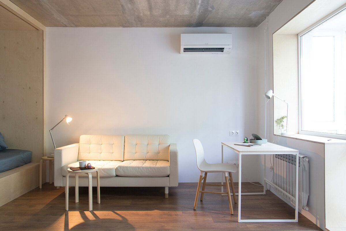 Архитекторы KDVA Architects сохранили бетонные потолки и кирпичную кладку на стенах, покрасили их в белый цвет и соорудили мебель из берёзовой фанеры. А единственной перепланировкой в панельной однушке стал новый дверной проём между кухней и гостиной. Ещё один дверной проём между кухней и гостиной превратил типовую однушку в удобную студию. Теперь пятиметровая кухня не кажется такой тесной, а в гостиной появилась возможность выделить зону спальни. Блок для сна соорудили из берёзовой фанеры. В него встроили систему хранения. Например, вертикальная панель слева скрывает сразу два шкафа. Доступ к одному открыт со стороны спальни, а к другому – через старый дверной проём в прихожей. Часть стен оштукатурили, сохранив при этом выступающую кладку кирпича. Дверные и оконные проёмы оформили листами фанеры. А в качестве напольного покрытия выбрали массивную доску. На отделке экономить не стали, потому что она наиболее долговечна, к тому же придаёт респектабельности бюджетному интерьеру. О