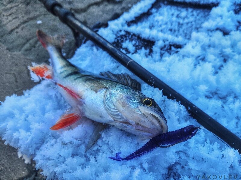 Морозное утро, туман идёт по реке, а берега встают прямо на глазах. Первый день декабря сразу поднял планку этого зимнего спиннингового сезона. Первые забросы давались не очень легко: сначала десяток на то, чтобы раскидать плетню, пропитанную Джонсонс бейби. Затем всё это дело начинает замерзает, и дальность заброса снова убывает. Да, хватило ума в такие условия взять на воду лишь ультралайт). На одной из проводок вымучиваю сумасшедшего окуня, стоявшего в береговой зоне. Откликнулся он на классический джиг с LureMax Pinhead Minnow 1.5 дюйма. Эта приманка в прошлом году спасала в полное бесклёвье, и в этот раз Софьино оценило такой ход.