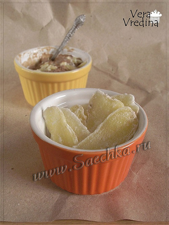 Обсыпанные сахаром домашние имбирные цукаты могут храниться при комнатной температуре несколько месяцев. Их очень вкусно употреблять, например, с домашним мороженым, особенно с шоколадным. Мммммм, как вкусно!